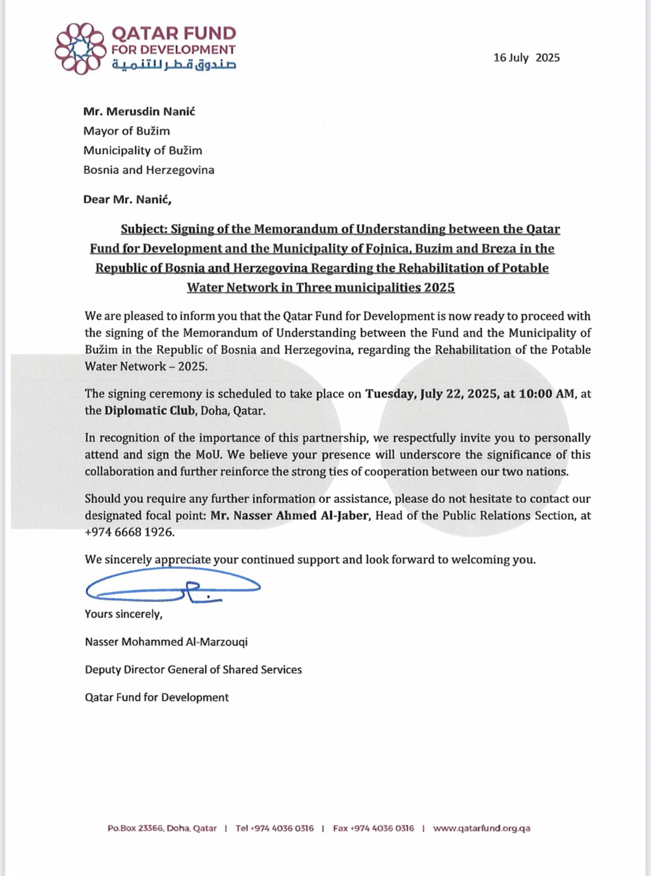 Na poziv Katarskog fonda za razvoj (Qatar Fund For Development – QFFD) načelnik općine Bužim, Mersudin Nanić, boravi u zvaničnoj posjeti Dohi, glavnom gradu države Katar, gdje održava niz značajnih sastanaka s ciljem jačanja saradnje i otvaranja novih prilika za razvoj naše općine.