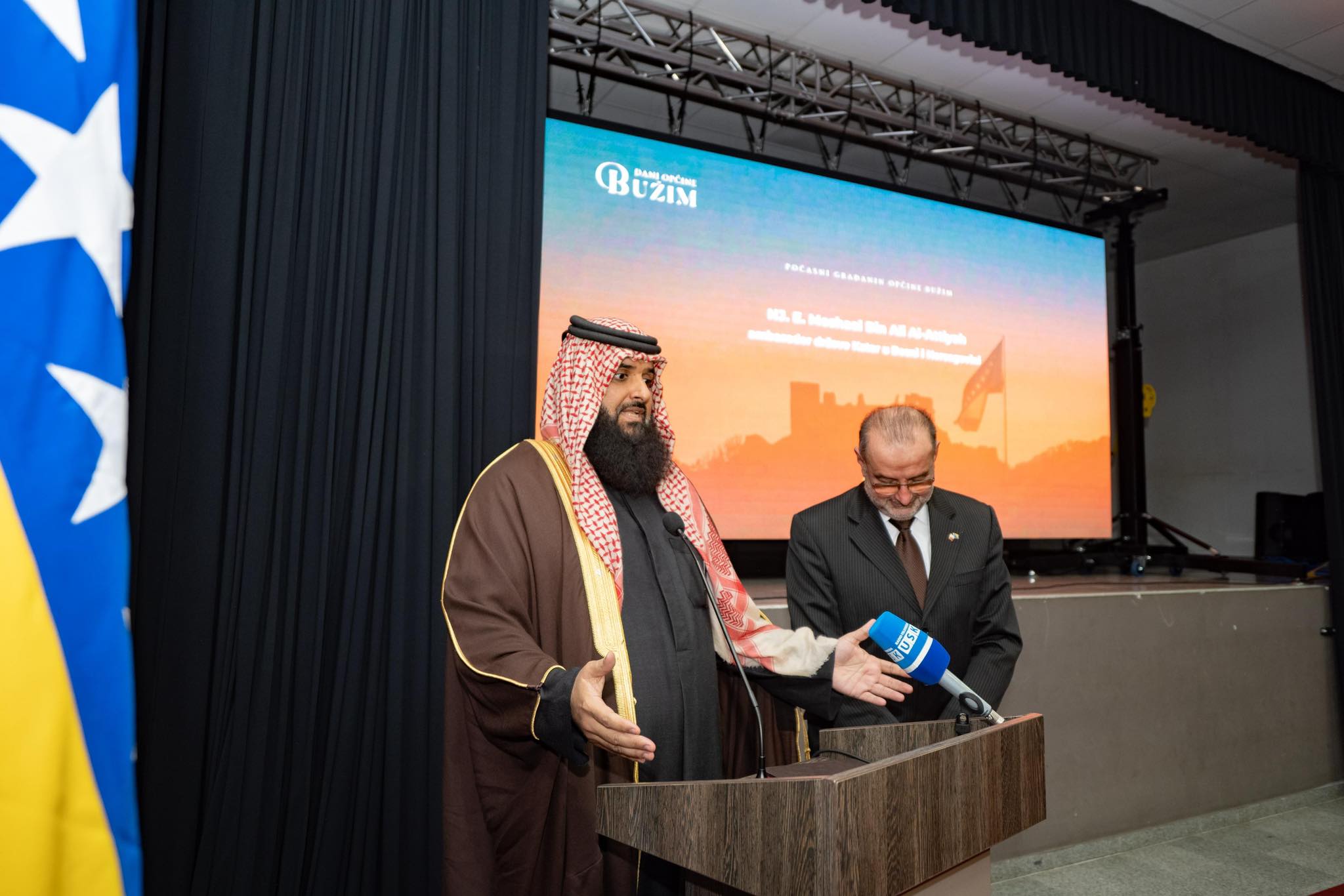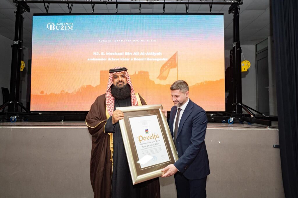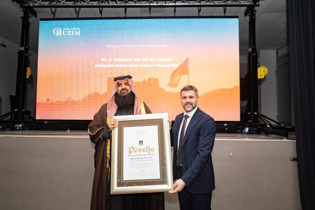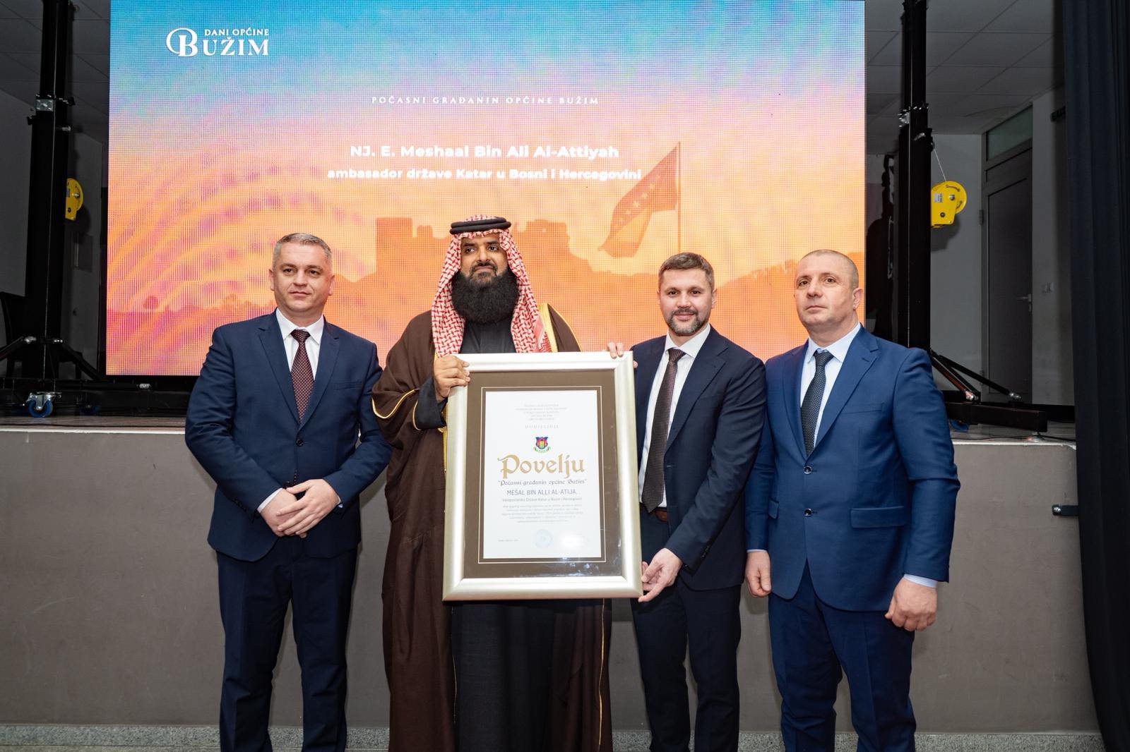 Ambasador Države Katar, NJ.E. Mešal bin Ali Al-Atija, proglašen počasnim građaninom Općine Bužim zbog njegovog izuzetnog i mjerljivog doprinosa razvoju naše općine. Kroz strateške infrastrukturne projekte, posebno u oblasti vodosnabdijevanja i komunalne mreže. Uz to, njegova principijelna podrška suverenitetu i međunarodnom ugledu Bosne i Hercegovine potvrđuje neraskidive veze naše dvije zemlje.