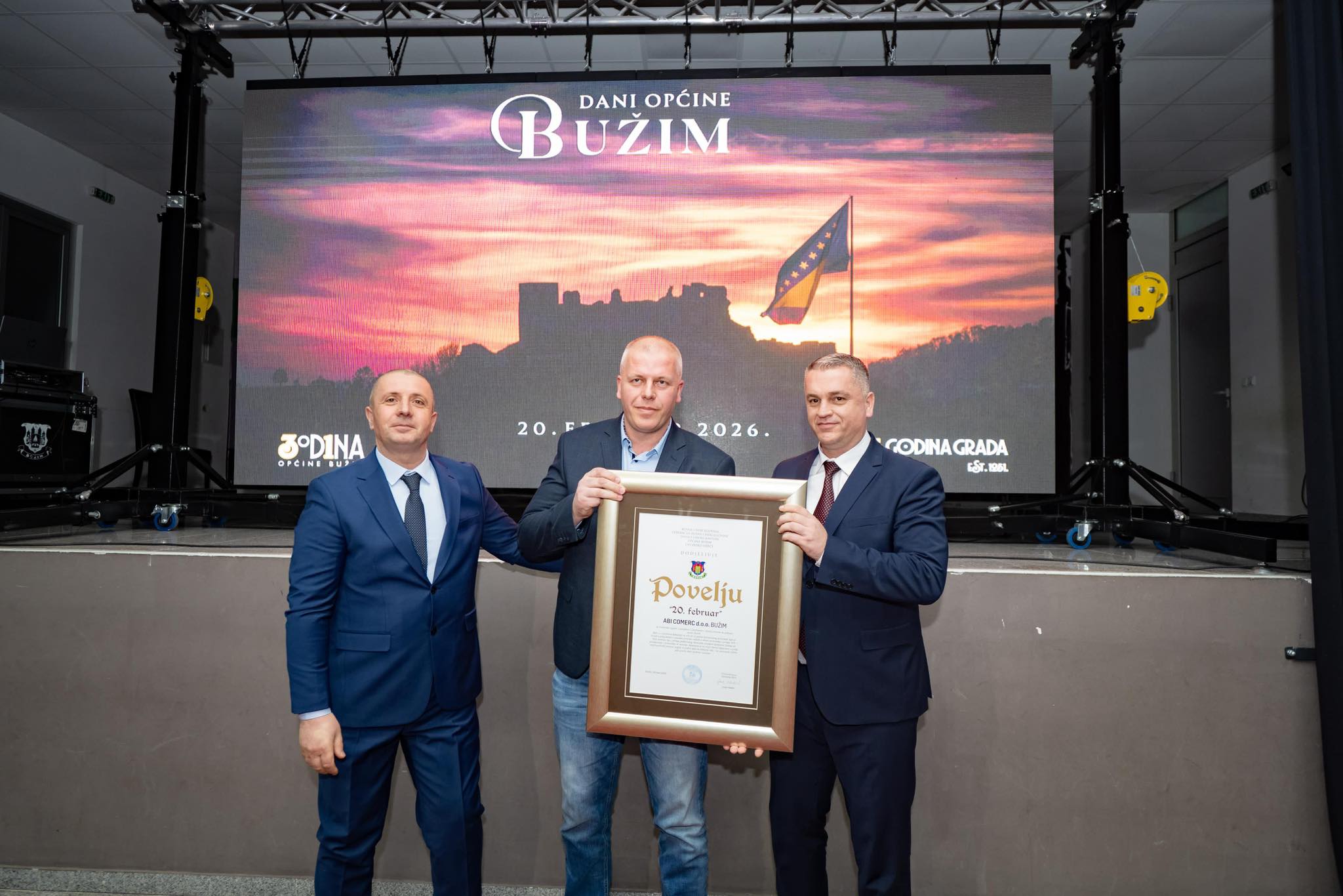 U nastavku programa dodijeljena je i Povelja s grbom Općine Bužim „NAGRADA 20. FEBRUAR“, najviše općinsko priznanje, za izvanredne uspjehe i izuzetna postignuća u radu ili poslovanju, te za doprinos razvoju privrede. Povelja s grbom Općine Bužim „NAGRADA 20. FEBRUAR“ dodjeljuje se firmi ABI COMERC d.o.o. Bužim.