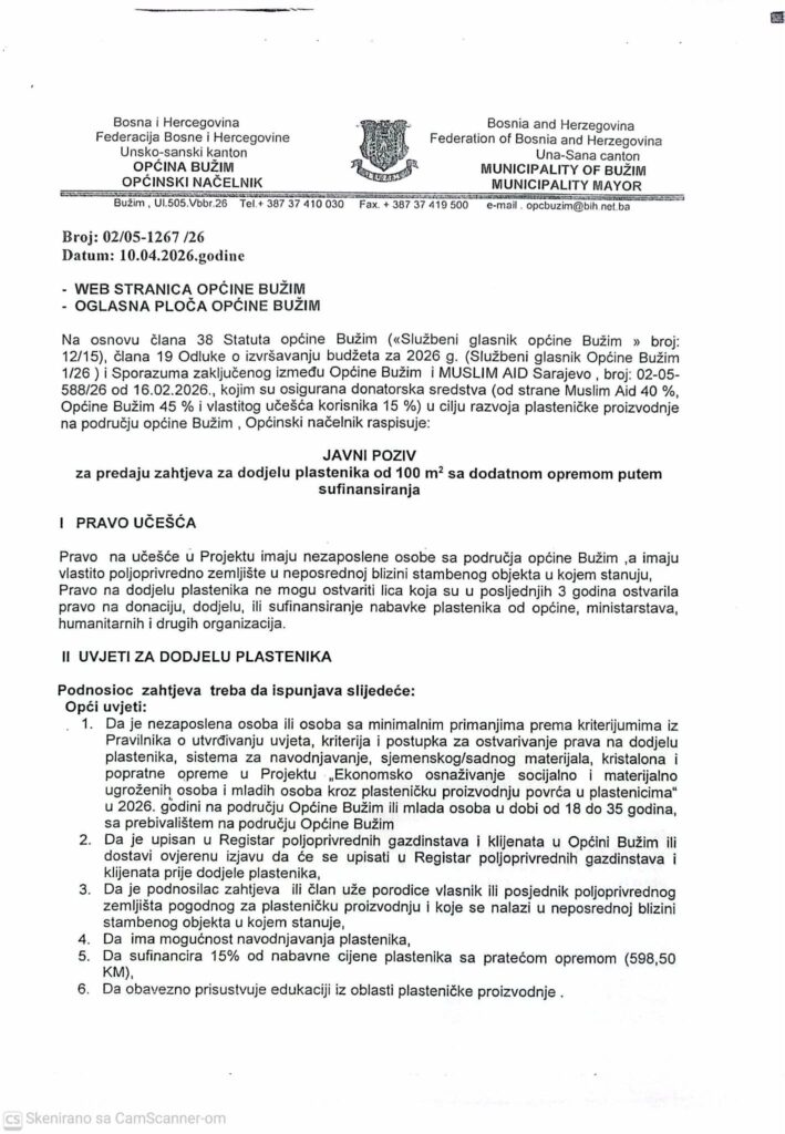 Općina Bužim u saradnji sa organizacijom Muslim Aid Association realizirat će projekat pod nazivom: „Ekonomsko osnaživanje socijalno i materijalno ugroženih osoba i mladih kroz plasteničku proizvodnju povrća“, koji podrazumijeva nabavku plastenika za zainteresovane korisnike s područja općine Bužim.