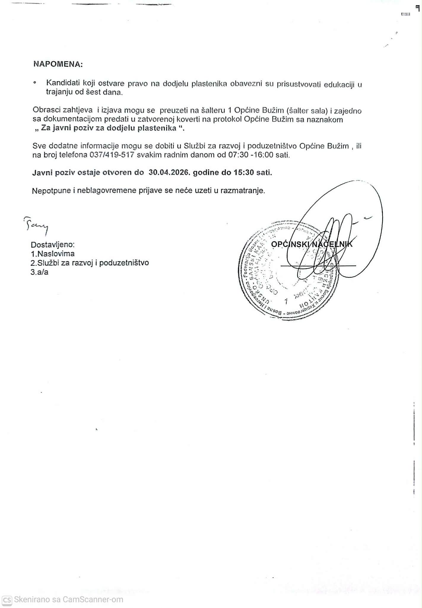 Javni poziv ostaje otvoren do 30.04.2026. godine. Sve dodatne informacije zainteresovani mogu dobiti u Službi za razvoj i poduzetništvo Općine Bužim svakog radnog dana, dok se prijavni obrasci mogu preuzeti u prilogu javnog poziva, kao i u Centru za pružanje usluga građanima, u periodu od 07:30 do 16:00 sati.