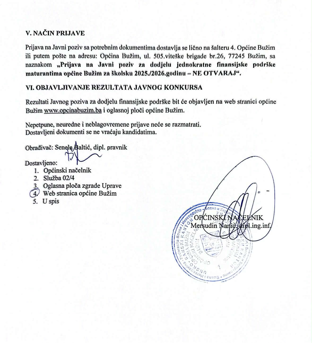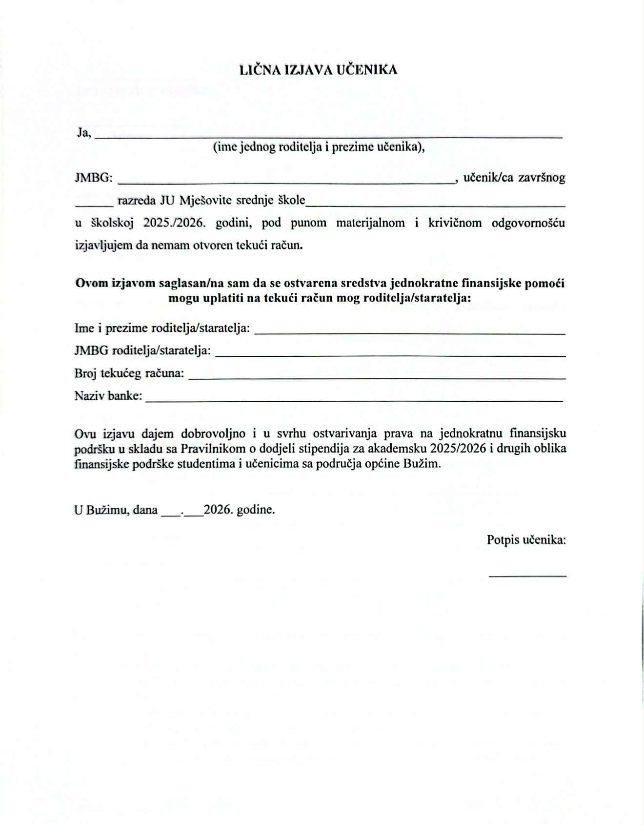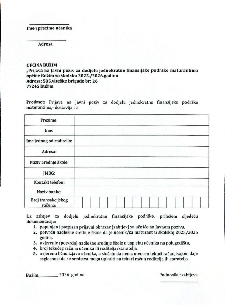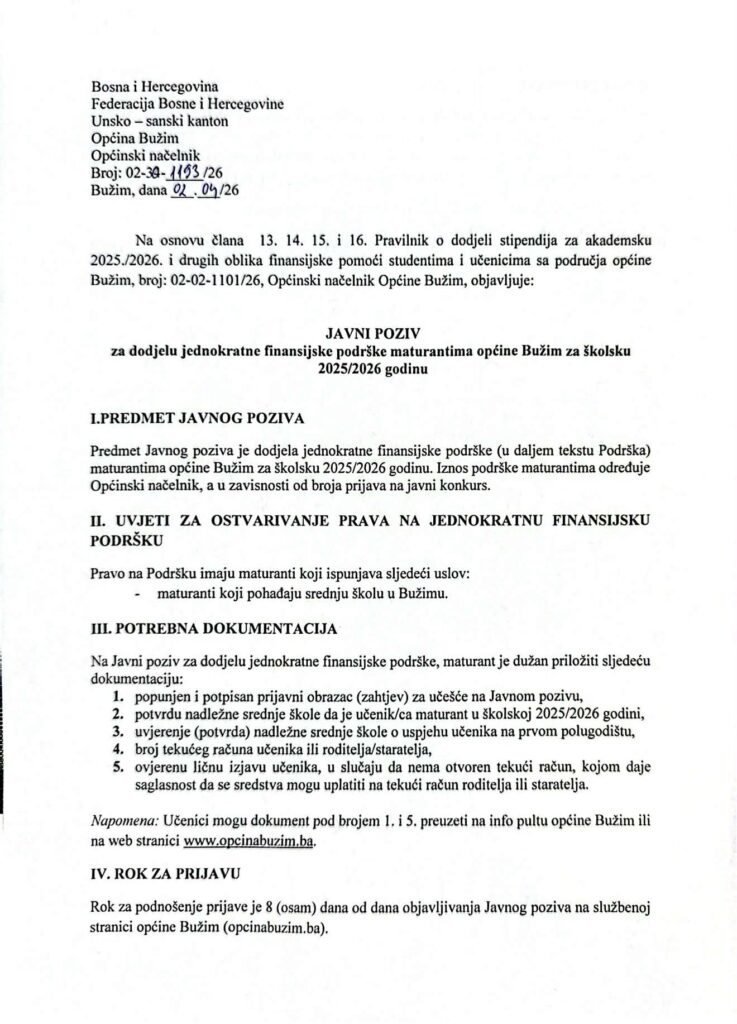 Općina Bužim je u Budžetu za 2026. godinu, po prvi put, osigurala sredstva za jednokratnu finansijsku podršku maturantima, čime je napravljen konkretan i značajan iskorak u podršci mladim generacijama. Ova mjera rezultat je inicijative vijećnika u Općinskom vijeću, uz podršku većine, s ciljem da se maturantima pruži direktna i vidljiva podrška na završetku njihovog srednjoškolskog obrazovanja. Tim povodom, danas je zvanično objavljen Javni poziv za dodjelu jednokratne finansijske podrške maturantima koji završavaju srednju školu na području općine Bužim u školskoj 2025/2026. godini. Cilj ove mjere je sufinansiranje troškova proslave mature, koji za veliki broj porodica predstavljaju značajan finansijski izdatak. Planiranjem sredstava u Budžetu Općine Bužim za 2026. godinu, na ekonomskom kodu 614234 u okviru Službe za opću upravu i društvene djelatnosti – isplata stipendija, jednokratnih podrški i nagrada, omogućava se da svaki maturant, bez obzira na materijalni status, dostojanstveno obilježi kraj svog školovanja. Pravo na ovu podršku imaju maturanti koji pohađaju srednju školu na području općine Bužim. U prilogu ove objave dostupan je Javni poziv sa detaljnim uslovima i potrebnom dokumentacijom, kao i prijavni obrazac (zahtjev) te obrazac lične izjave za učenike koji nemaju otvoren tekući račun. Rok za podnošenje prijava je 8 dana od dana objavljivanja Javnog poziva na oglasnoj ploči i službenoj web stranici Općine Bužim. Pozivaju se svi maturanti da pravovremeno podnesu prijave i iskoriste pravo na ovu značajnu podršku Općine Bužim.